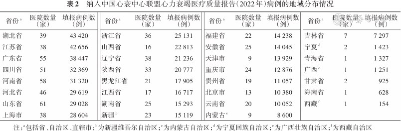 1.数据来源:本次心力衰竭医疗质量报告数据来源于全国通过心衰中心认证的753家医院,患者入院日期为 2017 年 1 月1日至 2022 年 11月30日,共计538 747例,其中三级医院558家、纳入病例468 556例(87.8%),二级医院195家、纳入病例65 204例(12.2%);标准版心衰中心475家、纳入病例449 266例(83.4%),基层版心衰中心278家、纳入病例89 370例(16.6%)。纳入医院分布于我国31个省、自治区、直辖市,医院及患者在全国的分布详见表2。按照入院日期,2017、2018、2019、2020、2021及2022年纳入的例数分别为25 993例(4.8%)、84 157例(15.6%)、122 077例(22.7%)、113 705例(21.1%)、117 140例(21.8%)及 75 355例(14.0%)。纳入病例存在不同项目的缺失,是真实数据情况的体现,经初步判断为随机缺失,故不详细标注,在计算比例时按该项指标的实际总人群数量。