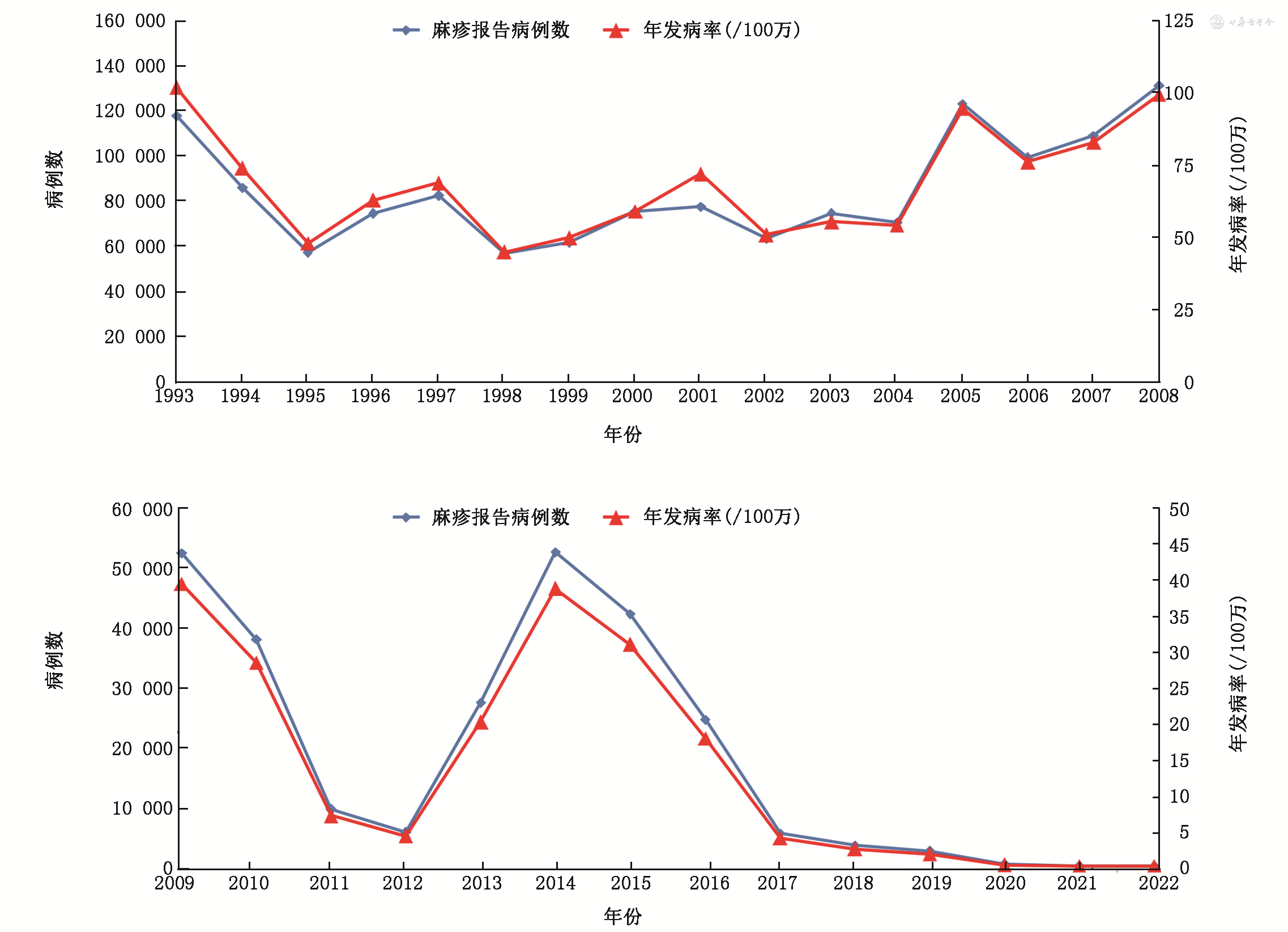 3. 扩大免疫规划时期(2008年至今):2008年,我国进入扩大免疫规划时期,在此期间,除常规免疫外,我国还开展了多轮麻疹补充免疫活动(supplementary immunization activities,SIAs),以进一步缩小免疫差距。2004年至2009年间,我国27个省根据对本省麻疹发病率和易感人群的分析,对8个月至14岁的儿童开展了相应的SIAs[16, 17]。2010年9月,全国31省份对8个月至14岁的儿童同步开展SIAs,10 d内共有1.034亿儿童接种了疫苗[16, 17]。此后,各地根据其当地麻疹风险评估结果又实施了后续SIAs,2011—2018年共有9 037万儿童和成人接种了疫苗[18, 19, 20]。2020年,根据麻疹、风疹、腮腺炎防控工作需要,我国对MCV免疫程序再次进行调整,自2020年6月起,实施8月龄和18月龄各接种1剂次MMR的免疫策略(http://www.nhc.gov.cn/jkj/s3589/202001/ba151e4ad7824ad6950d8d24879a2235.shtml)。在各项措施的实施下,2009—2012我国麻疹年报告发病率持续下降,2013—2015年虽有所回升,但基本保持在40/100万以下,此后,发病率逐年下降,2021年和2022年达到历史最低点(0.4/100万)(图1)。