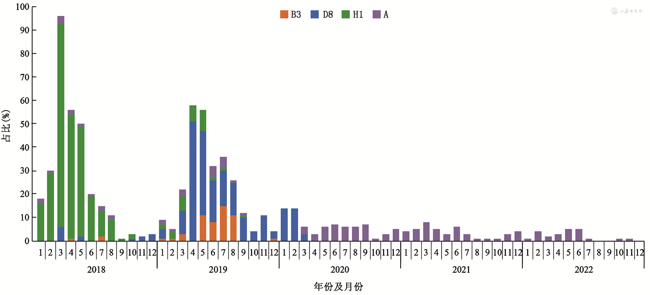 我国自1993年开始开展病毒学监测,截至2022年,全国30个省份(西藏除外)共上送17 657份病毒分离株和麻疹临床标本,基因型别鉴定结果显示我国共监测到9个基因型,分别为H1(16 981,96.2%)、D8(283,1.6%)、D9(72,0.4%)、B3(68,0.4%)、D11(10,0.06%)、A(240,1.4%),D4,G3和H2各监测到一例[30, 31, 32, 33, 34, 35, 36, 37, 38]。我国连续近30年的覆盖全国范围的病毒学监测结果表明:H1是我国麻疹病毒流行的绝对优势本土基因型;自2009年起,各省各地陆续监测到国外输入的非H1基因型病毒,包括D9、D4、D11、D8、B3和G3。2009—2018年,我国麻疹流行仍以H1(15 454/15 734,98.2%)为主,同时伴随其他输入基因型(B3、D8和D9)的小范围有限流行传播[35, 36, 37]。2019年,H1基因型的比例从2018年的89.8%(274/305)迅速下降到2019年的10.9%(30/275),最后一例H1基因型麻疹病例于2019年9月21日在云南省监测到,自此H1基因型MeV在我国的传播已被阻断[30],消除麻疹工作取得显著进展。输入性B3自2013年输入我国后,曾有短时间的流行,但未建立本土循环,2019年12月后未再监测到。D8基因型自2012年首次于我国发现后,曾经在我国建立了本土循环,并且在2019至2020年3月成为我国流行的优势基因型,但自2020年4月以来,其传播已中断。2020年4月至今,只监测到疫苗相关病例,没有再监测到麻疹野病毒,表明在新型冠状病毒感染疫情期间,我国基于实验室的麻疹监测系统一直运行良好(图2)。