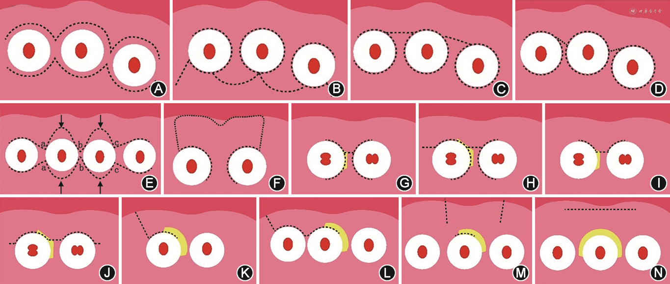 4. 简化龈乳头保存瓣(simplified papilla preservation flap,SPPF):MPPT在邻间隙较宽(>2 mm)时(如前牙和前磨牙区域)临床效果较成功,但MPPT对于窄的邻间隙(≤2 mm)和后牙的邻间隙技术要求高,并且临床成功率低。为此,1999年Cortellini等[9]进一步提出了SPPF,其主要特点是将MPPT的唇颊侧切口改良为更偏向邻间隙的斜切口(图1D)。