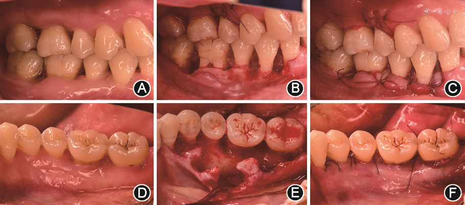 手术的关键在于切口设计(图1A),改良Widman瓣一般于尽量靠近龈缘的位置作内斜切口直达骨面,去除切口冠方的袋内壁上皮和炎性组织。操作中翻瓣区域局限至牙槽嵴顶处,一般不作骨修整,仅在骨外形妨碍龈瓣的复位贴附时进行修整。彻底清创后,龈瓣复位应尽量覆盖邻面的牙槽骨以减少骨吸收。龈瓣复位缝合过程中注意出针点应从组织截面穿出而非穿透组织全层,尽量避免因进针过深穿透全层组织导致组织边缘内陷或出现邻间乳头区域瓣太短,无法形成无张力对位缝合[7]。