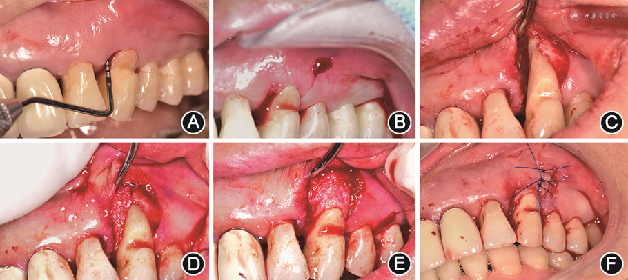 改良Widman瓣的适应证是经过基础治疗后探诊深度(probing depth,PD)≥4 mm伴探诊出血或PD>5 mm但不需要做骨成形者[5]。其优点主要是利于牙龈愈合,可以有效降低PD,且术后牙龈退缩较少。