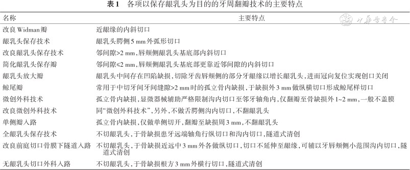 各项以保存龈乳头为目的的牙周翻瓣技术的主要特点