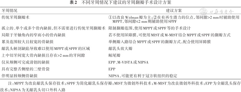 | 传统牙周翻瓣术 | ①以改良Widman瓣为主;②在有再生潜力的位点,邻间隙>2 mm时辅助使用MPPT,邻间隙≤2 mm则辅助使用SPPF |