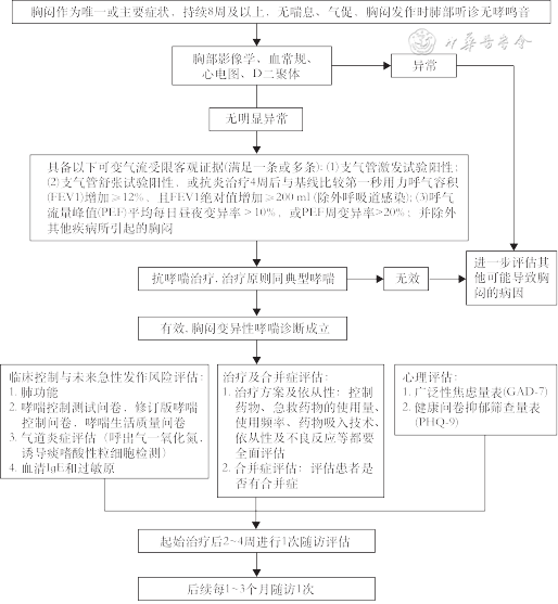 3.胃食管反流病:胃食管反流病通常以反酸、烧心、胸痛等食管症状为主要表现,但部分患者可仅表现出一系列食管外症状如咳嗽、喘息、声嘶等,甚至以胸闷为主要表现而求诊。另外,胃食管反流病往往也是哮喘的共病,胃食管反流可以诱发或加重哮喘的发作,容易导致哮喘控制不佳,严重影响患者的生活质量,并产生焦虑、抑郁等心理问题[33,35]。因此,对于疑诊CTVA的患者,应注意排除或警惕合并胃食管反流病。诊断性质子泵抑制剂治疗推荐用于疑似伴有典型胃食管反流病的患者,需要强调的是,由于食管外反流往往对抑酸药物的敏感性较差,药物的剂量最好是常规的双倍,疗程不要少于8周[36, 37, 38]。对于抑酸治疗无效患者,上消化道内镜检查可协助诊断糜烂性食管炎、Barrett食管、食管裂孔疝等。值得注意的是,大部分有症状的患者在内窥镜检查时并未发现糜烂性反流病的客观证据[39, 40],对于这类患者,进一步行动态反流监测(如24 h食管pH值联合阻抗监测或96 h无线食管pH值监测等)有助于评估是否存在病理性反流以及明确反流事件与症状的相关性[40, 41]。