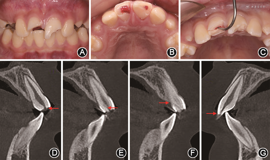 方位置,累及髓腔;F:11腭侧冠根折,箭头示折裂线根方位置显示不清,约平齐牙槽嵴顶;G:21冠折露髓,箭头示露髓位置3.影像学检查:见图1D~G。锥形束CT显示11、21冠折及髓,牙根发育至NollaⅩ期,牙周膜间隙略增宽,未见明显根折。11腭侧折裂线