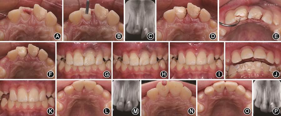 面像;P:11纤维桩修复后根尖片(2)11根管治疗术:11唇腭侧使用4%阿替卡因肾上腺素注射液行局部浸润麻醉,于露髓处扩大开髓洞型,可见腭侧折裂线起始于断面以下约1 mm处的髓腔腭侧面,延伸至釉质牙骨质界下方根面;拔髓,根尖定位仪(VDW,德国)测量工作长度为20 mm,使用ProTaper Universal机用镍钛锉(登士柏,瑞士)预备根管至F4,试主牙胶尖到达工作长度(图2B),干燥根管后采用热熔牙胶结合iRoot SP糊剂(Innovative BioCreamix Inc,加拿大)垂直加压充填根管中下段,根尖片示根充恰填(图2C),小干棉球置于根管口,暂封物充填至平齐腭侧折裂线。