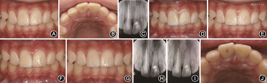 (7)术后随访:术后6个月复查见21因再次外伤导致牙冠切端缺损(图3A),11、21无不适症状,腭侧探无牙周袋(图3B),根尖片示根尖周均无明显异常(图3C);因21牙体缺损较少,于缺损唇腭面分别制备固位沟(图3D),采用37%磷酸酸蚀粘接及复合树脂充填修复牙冠形态(图3E)。术后12及24个月复查,11、21无不适症状及阳性体征,断冠粘接及充填物完好,咬合功能正常(图3F,G),根尖片示11根充密实、根尖周无低密度影像(图3H),但切髓24个月的21表现出明显的根管闭锁(图3I);11、21牙周探诊均无牙周袋,牙龈色泽正常、致密,11腭面探及连续完整稳定的牙周附着(图3J)。