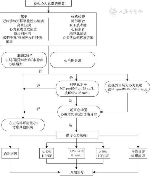 老年心衰患者诊断和评估的特殊性:(1)不典型症状更为多见,更易发生肺水肿、低氧血症及重要器官灌注不足。(2)以HFpEF为多见(40%~80%),常合并冠心病,但临床上易误诊和漏诊。尸检病理研究显示高龄老年HFpEF患者中心肌淀粉样变检出率高[201]。(3)多病因共存,合并症多,研究发现>65岁的老年人中超过40%具有5个以上合并症,且随年龄增长,非心血管合并症增多。(4)胸部影像学、超声心动图、血BNP水平在老年心衰诊断中特异性降低。