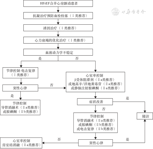 房颤是心衰患者最常合并的心律失常,二者具有共同的危险因素,常同时存在,相互促进,互为因果。Framingham心脏研究显示,在新发心衰患者中超过半数合并房颤,在新发房颤患者中超过1/3患有心衰,二者同时存在时死亡风险更高[159]。心衰合并房颤患者的管理路径见图5。
