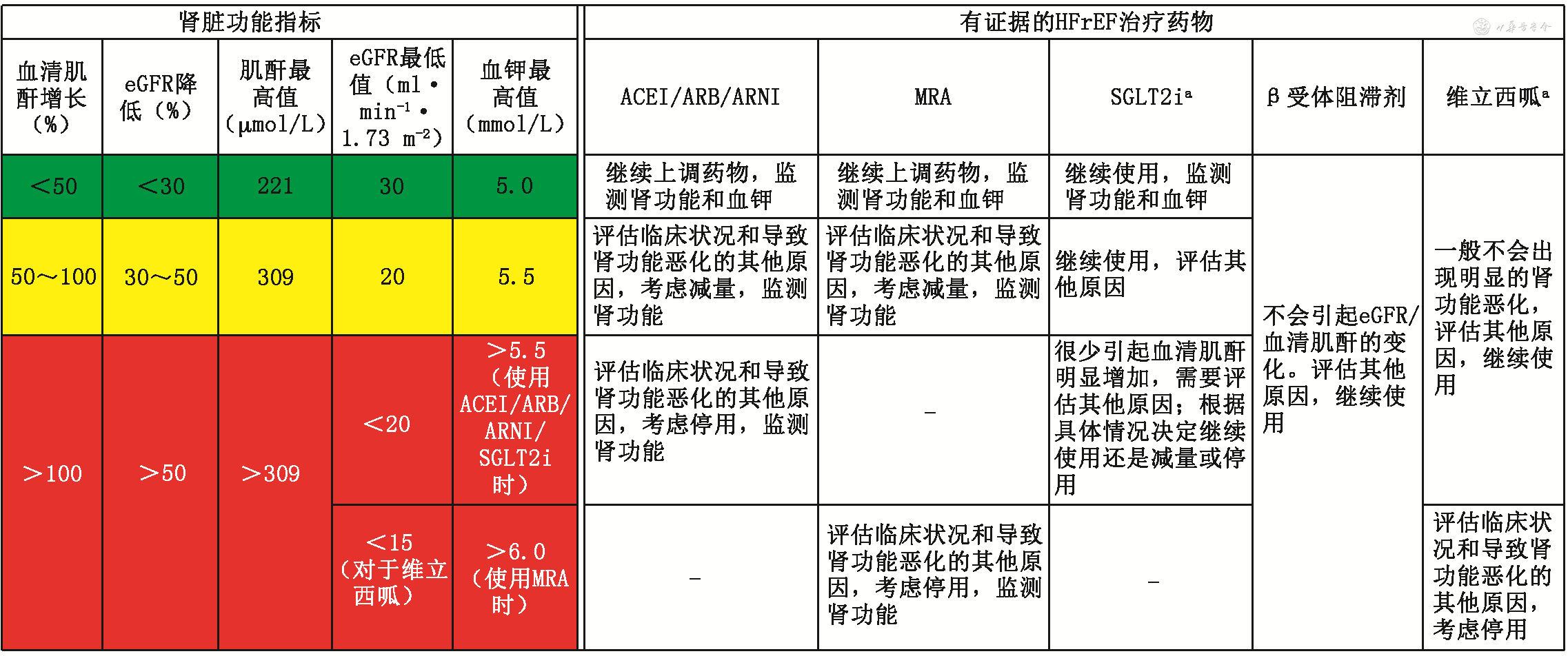 HFrEF:射血分数降低的心力衰竭,eGFR:估算的肾小球滤过率,ACEI:血管紧张素转换酶抑制剂,ARB:血管紧张素Ⅱ受体阻滞剂,ARNI:血管紧张素受体脑啡肽酶抑制剂,MRA:醛固酮受体拮抗剂,SGLT2i:钠-葡萄糖协同转运蛋白2抑制剂;a专家意见,无强的证据;-表示无相应内容