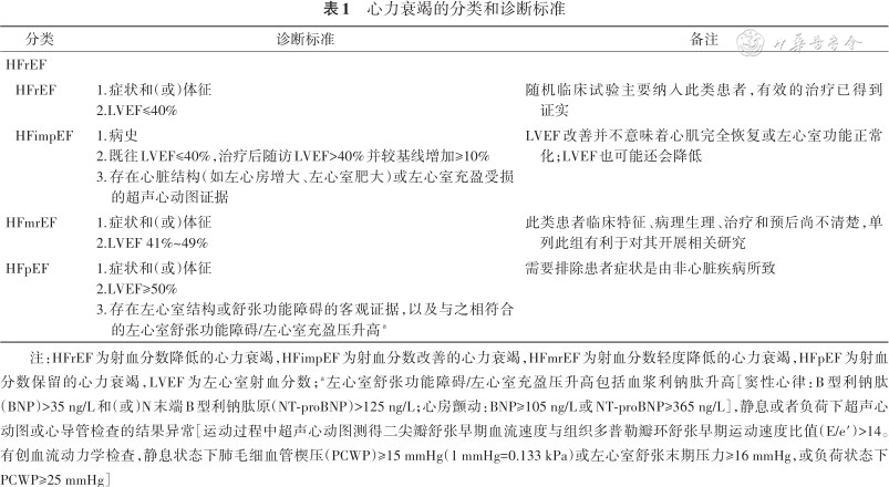 注:HFrEF为射血分数降低的心力衰竭,HFimpEF为射血分数改善的心力衰竭,HFmrEF为射血分数轻度降低的心力衰竭,HFpEF为射血分数保留的心力衰竭,LVEF为左心室射血分数;a左心室舒张功能障碍/左心室充盈压升高包括血浆利钠肽升高[窦性心律:B型利钠肽(BNP)>35 ng/L和(或)N末端B型利钠肽原(NT-proBNP)>125 ng/L;心房颤动:BNP≥105 ng/L或NT-proBNP≥365 ng/L],静息或者负荷下超声心动图或心导管检查的结果异常[运动过程中超声心动图测得二尖瓣舒张早期血流速度与组织多普勒瓣环舒张早期运动速度比值(E/e′)>14。有创血流动力学检查,静息状态下肺毛细血管楔压(PCWP)≥15 mmHg(1 mmHg=0.133 kPa)或左心室舒张末期压力≥16 mmHg,或负荷状态下PCWP≥25 mmHg]