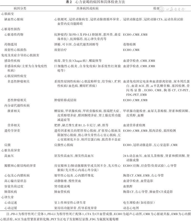 原发性心肌损害和异常是引起心衰最主要的病因(表2),除心血管疾病外,非心血管疾病也可导致心衰。识别这些病因是心衰诊断的重要部分,从而能尽早采取特异性或针对性的治疗。