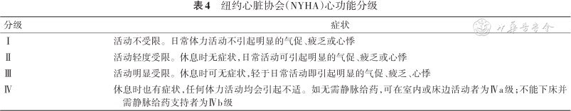 | Ⅳ | 休息时也有症状,任何体力活动均会引起不适。如无需静脉给药,可在室内或床边活动者为Ⅳa级;不能下床并需静脉给药支持者为Ⅳb级 |