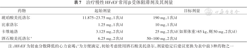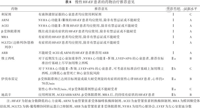 高血压是心衰的主要危险因素,我国心衰患者合并高血压的比率为50.9%[10],高血压伴慢性心衰通常早期表现为HFpEF,晚期或合并其他病因时表现为HFrEF。前瞻性研究证实,心衰患者中较高的基线收缩压、舒张压和脉压水平与较高的不良事件发生率相关。控制血压有助于改善心衰患者预后,预防与高血压有关的并发症。应遵循高血压指南,优化合并高血压的心衰患者的血压控制,高血压合并HFrEF建议将血压降到<130/80 mmHg[40](Ⅰ,C),降压药物优选ARNI/ACEI/ARB、β受体阻滞剂和MRA,这些药物需要滴定上调至靶剂量或者最大耐受剂量(Ⅰ,C),血压仍不达标可联合利尿剂和氨氯地平(Ⅰ,A)或非洛地平(Ⅱa,B);禁用α受体阻滞剂(Ⅲ,A)、莫索尼定(Ⅲ,B)、地尔硫䓬和维拉帕米(Ⅲ,C)。高血压治疗是HFpEF治疗中的重要环节,治疗策略与HFrEF相同。