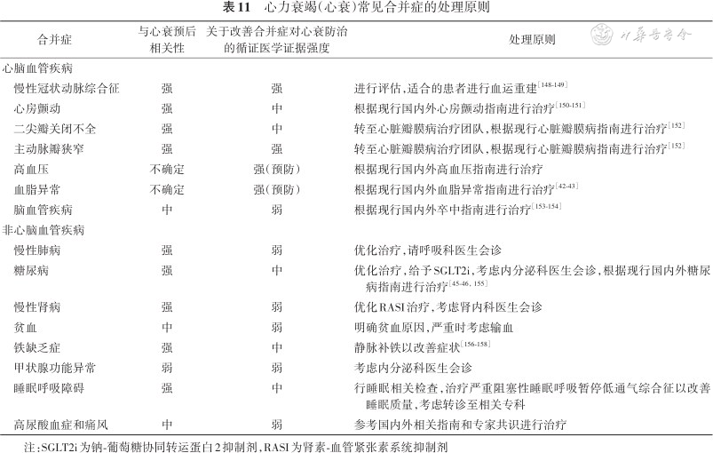 | 合并症 | 与心衰预后相关性 | 关于改善合并症对心衰防治的循证医学证据强度 | 处理原则 |