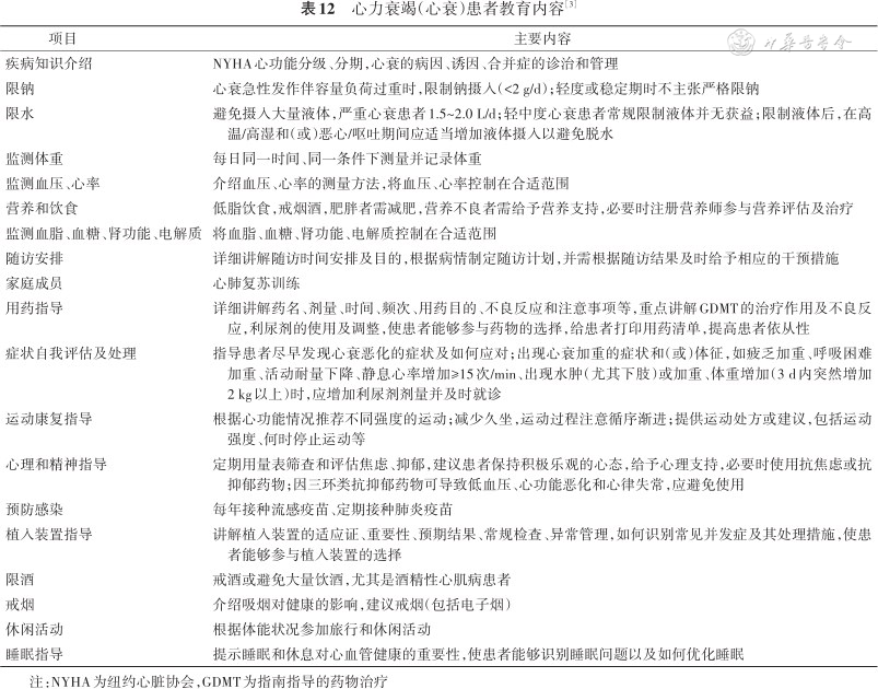 患者缺乏自我管理的知识和技巧是心衰反复住院的重要原因之一。通过教育能提高患者的自我管理能力和药物依从性,有助于其改善生活方式(Ⅰ,B)。荟萃分析显示,改善心衰治疗的长期依从性,可减少心衰再住院和死亡率[198]。患者教育主要内容需涵盖心衰的基础知识、症状的监控、药物治疗及依从性、饮食指导和生活方式干预等(表12)。