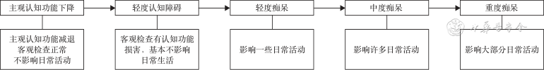 阿尔茨海默病(Alzheimer′s disease,AD)及其他认知障碍疾病是发生于老年期和老年前期的一组神经系统退行性疾病,起病隐袭且病程呈进行性发展,临床表现以获得性认知功能损害为核心症状,涉及记忆、学习、定向、理解、判断、计算、语言和视空间等认知域,不同程度地影响日常生活能力及社会职业功能,最终进展为全面性痴呆[1]。在痴呆患者中AD最常见,约占65%[2]。疾病进程通常可由主观认知功能下降(subjective cognitive decline,SCD)➝轻度认知功能障碍(mild cognitive impairment,MCI)➝痴呆(dementia)逐渐进展(图1)。其中SCD是指个体主观上认为自己较之前正常状态有记忆或其他认知域下降,但客观的神经心理测试在正常范围内的状态[3]。随后患者的记忆力或其他认知功能较前减退,客观的神经心理检查异常,但其日常生活能力并未受到明显影响,且未达到痴呆诊断标准[4],称为MCI阶段。当认知功能障碍引起患者基本的日常生活能力受损时则进展为痴呆期,包括轻度、中度和重度痴呆三个阶段[5],最终患者通常死于肺部感染、褥疮、营养不良和心力衰竭等并发症。由于患者认知能力下降,出现走失或意外引起的死亡风险也增加。