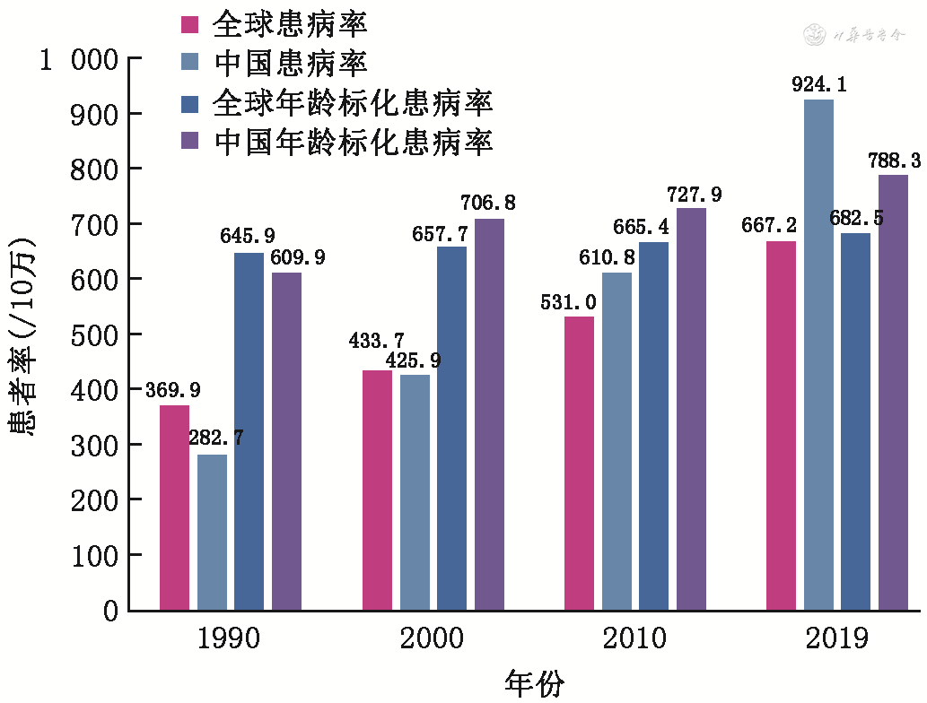 根据GBD数据,2019年全球AD及相关痴呆的患病人数达到 5 162万[95%不确定性区间(uncertainty interval,UI):4 428万~5 902万],总体患病率为667.2/10万(95%UI:572.2/10万~762.8/10万),年龄标化患病率为682.5/10万(95%UI:585.2/10万~782.7/10万);同年,我国AD及相关痴呆总人数为1 314万(95%UI:1 102万~1 530万),大约占全球AD患者总人数的25.5%,我国AD及相关痴呆总体患病率为924.1/10万(95%UI:774.9/10万~1 075.6/10万),年龄标化患病率为788.3/10万(95%UI:664.6/10万~912.8/10万)(图2)[6]。