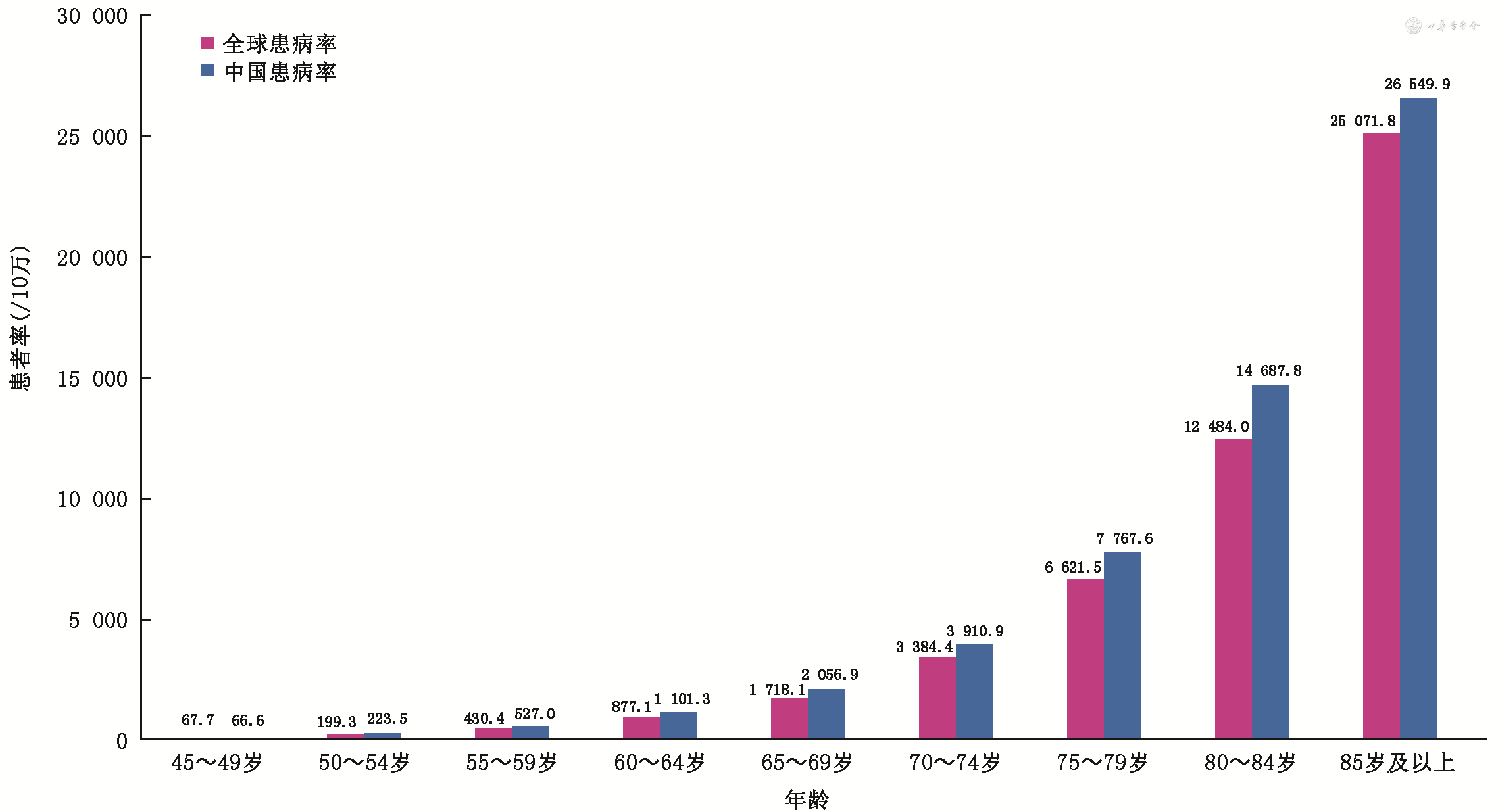 随着年龄的增长,AD及相关痴呆患病率呈指数增长(图3)[6]。MCI和SCD患病率也呈明显的上升趋势。荟萃分析结果显示,我国60~69岁、70~79岁和80岁及以上的老年人群中MCI患病率分别为15.1%(95%CI:12.3%~17.9%)、24.4%(95%CI:20.9%~28.0%)和37.1%(95%CI:30.9%~43.3%)[7],SCD患病率分别为38.0%(95%CI:21.4%~56.2%)、45.2%(95%CI:34.9%~56.7%)和60.3%(95%CI:50.8%~69.5%)[8]。