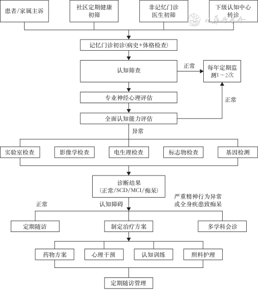 我国认知障碍诊疗中心分为核心高级认知障碍诊疗中心、高级认知障碍诊疗中心、记忆防治中心三个层级[124]。核心高级认知障碍诊疗中心(以下简称核心高级认知中心)在认知障碍疾病规范化诊疗体系建设中处于引领地位,为国内本领域的领军医院,具有全国领先的医疗、教学和科研水平,具有丰富的认知障碍疾病诊疗经验和完备的认知障碍疾病诊疗基础设施[124]。高级认知障碍诊疗中心(以下简称高级认知中心)是认知障碍疾病规范化诊疗体系中的中坚力量,发挥承上启下的桥梁作用,为区域内具有龙头示范作用的大型医疗机构,在区域内具有一定的医疗服务辐射能力及影响力,具备开展认知障碍疾病诊疗工作的人员和设备,能配合核心高级认知中心的工作部署[124]。记忆障碍防治中心(以下简称记忆防治中心,含记忆门诊)是认知障碍疾病规范化诊疗体系的基层力量,发挥重要的支撑作用,主要为县级医院和社区医疗机构[124]。我国认知障碍诊疗中心诊疗流程图如图4[124]。