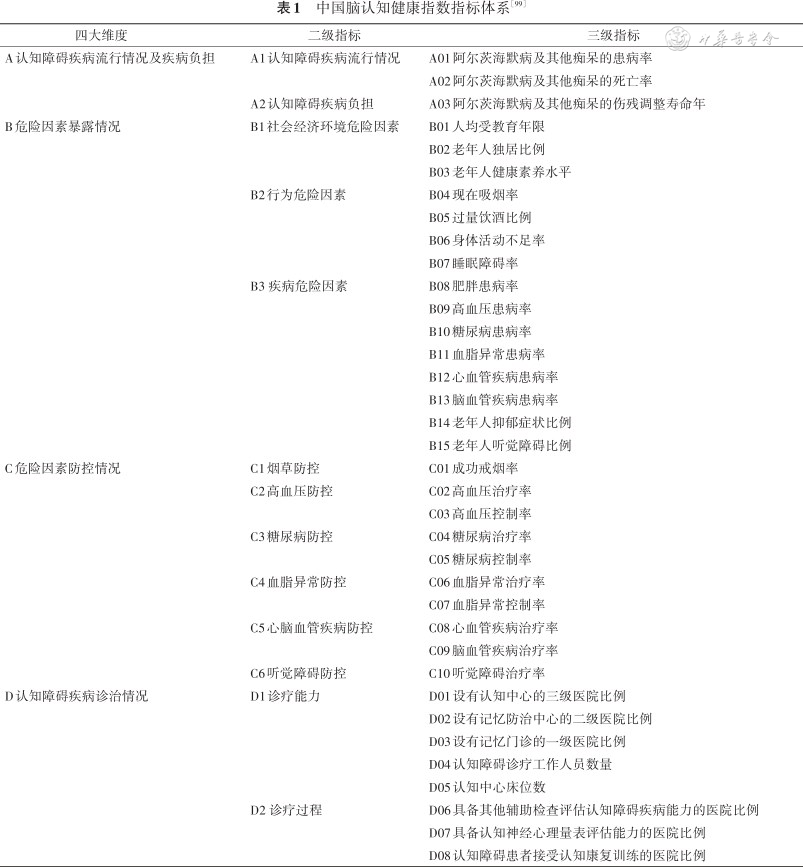 为全面、客观、科学地评估我国31个省、自治区、直辖市人群认知障碍疾病防控的综合能力,指导卫生资源的优化配置,2023年4月中国发布了中国脑认知健康指数,该指数旨在建立一个反映我国人群脑认知健康的综合指数,以反映全国及各省份人群整体脑认知健康状况,了解认知障碍疾病的流行和发展趋势,评价我国认知障碍疾病防治水平,为相关决策提供科学依据。通过两轮德尔菲专家咨询和层次分析法确定了一个包含4个维度(A认知障碍疾病流行情况及疾病负担、B危险因素暴露情况、C危险因素防控情况、D认知障碍疾病诊治情况)、13个二级指标、36个三级指标的中国脑认知健康指数指标体系(表1)[99]。