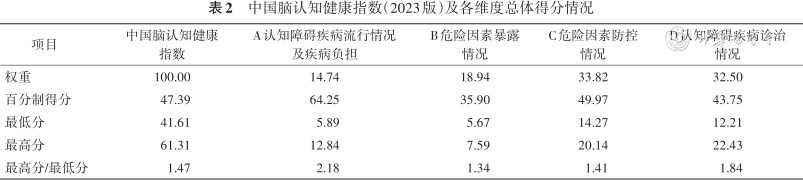 《中国脑认知健康指数(2023)》首次构建了中国认知障碍疾病防控的综合评价指标体系,依托国家级大数据勾勒出我国脑认知健康版图,全面地展示了脑认知相关指标的情况以及各省的综合排名,用于反映各省份痴呆防控的优势和不足,为改善中国人群脑认知健康提供重点方向,为各省开展认知障碍疾病防治工作注入强劲动力。中国脑认知健康指数的落地应用能够有效地指导各地优化认知障碍疾病的防控策略。在未来,中国脑认知健康指数的评分将不断更新,通过动态监测脑认知健康变化,验证防控干预策略的有效性[99]。
