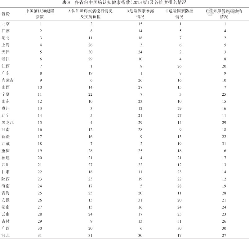 分省来看,排名第一的北京市在危险因素防控情况、认知障碍疾病诊治情况和认知障碍疾病流行情况及疾病负担方面均表现较好,分别为第一、第一和第二(表3)[100]。从指数可以看出各省份认知障碍疾病防治工作中的薄弱环节和需要重点关注的工作指标,可以为各省下一步加强认知障碍疾病防治工作指明方向。