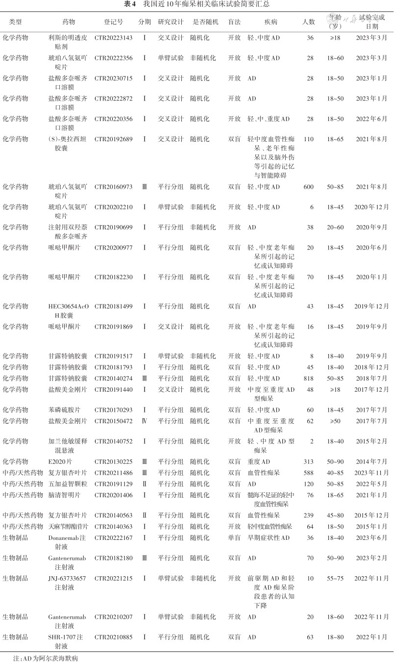近年来中国AD及其他认知障碍疾病治疗的药物临床试验数量有所增加。根据《药物临床试验登记和信息公示平台》(http://www.chinadrugtrials.org.cn/index.html)显示,过去10年(2014年1月1日至2023年12月31日)已经完成的AD及其他认知障碍疾病相关的药物临床试验共有31项,包括23项Ⅰ期试验、2项Ⅱ期试验、5项Ⅲ期试验、1项Ⅳ期试验(表4)。这些药物可分为3类:(1)化学药物,如盐酸多奈哌齐口溶膜和甘露特钠胶囊;(2)中药/天然药物,如复方银杏叶片、五加益智颗粒;(3)生物制品,如donanemab注射液和gantenerumab注射液(表4)。
