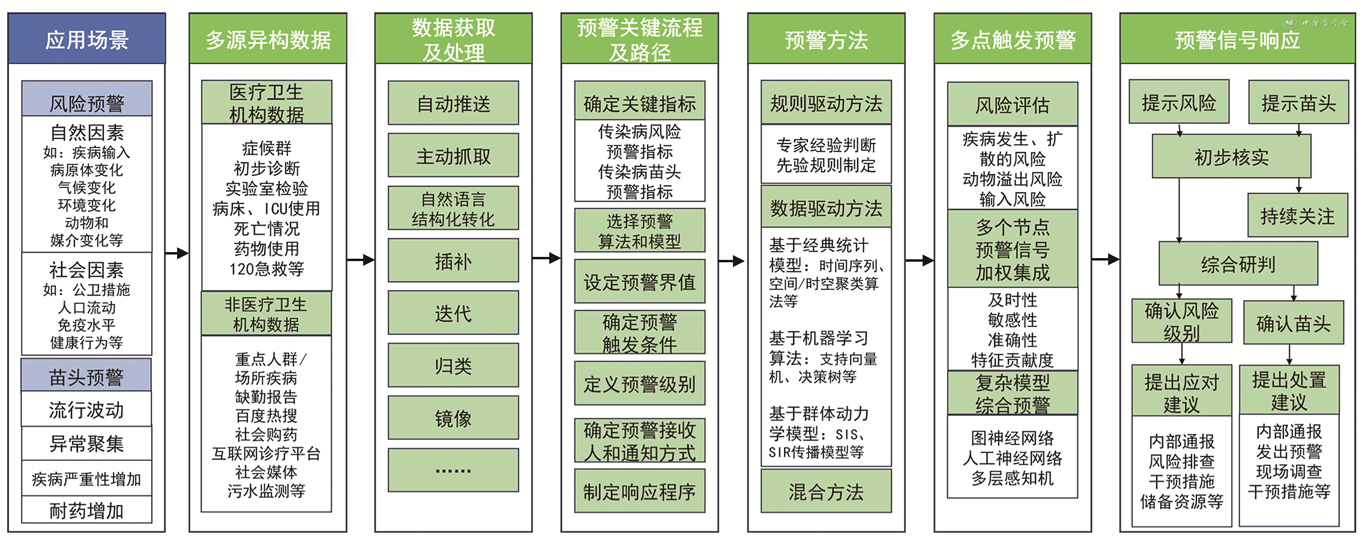 2. 多点触发智慧化监测预警(multi-point trigger intelligent surveillance and early warning):是指基于多渠道监测的智能化传染病预警技术,利用多渠道监测采集的传染病发生风险或异常“苗头”的相关数据,采用大数据、物联网、人工智能等数据处理与建模技术,综合研判分析结果,在传染病可能发生、发生早期、发展变化的多个关键节点,自动化、智能化发出预警信号。多点触发智慧化监测预警可以提高预警的灵敏度、准确性和及时性,减少人为干扰和工作失察[3, 4]。