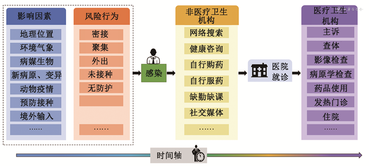 可以根据传染病发生潜在的风险阶段、人群就医前阶段和就医后阶段,将多来源、多环节的数据源分为风险因素数据、非医疗卫生机构数据和医疗卫生机构数据。
