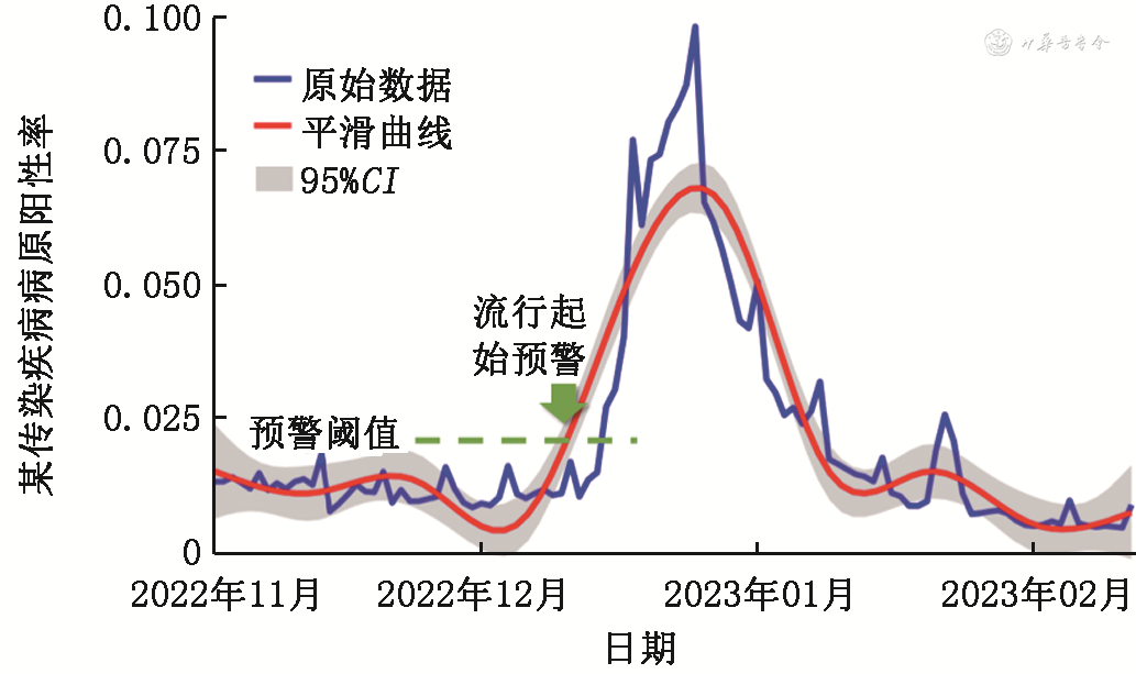以某传染病病原阳性率为例(图4),以历史基线数据的P50作为基线阈值,且满足上升规则中的某一预警条件时发出流行起始预警信号。值得注意的是,对于发热门诊就诊人次数、缺勤数等有明显的周末效应的观察数据,可通过7日移动平均数等方法消除周末效应。