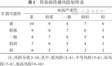 矩阵法是传染病发生风险最常见的评估方法。该方法结合疾病严重性和扩散的可能性对风险进行分类[32]。